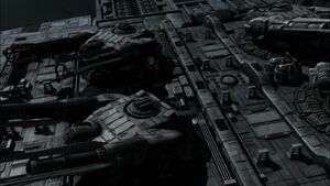 - ↑ Eine Standbildaufnahme in "Auferstehung" (beim Zeitindex 10:25) zeigt deutlich ein Loch in der Hülle an der Stelle, an der der Geschützturm stehen sollte. Jedoch wurde die Zerstörung des Turmes nicht extra gezeigt.