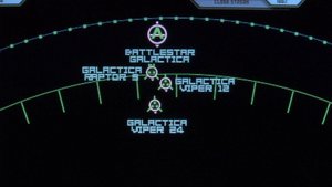 Die Symbole, die auf kolonialen DRADIS-Displays für Kampfsterne, Raptoren und Vipers verwendet werden, sieht man auf dem Bild rechts.