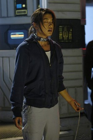 In der Zelle hat Sharon beinahe eine Fehlgeburt und wird auf die Krankenstation gebracht, wo Dr. Cottle das Kind aber retten kann. Dort wird sie zufällig von D'anna Biers gefilmt, einer Reporterin der Flottennachrichten, während diese Aufnahmen für eine Dokumentation macht. Diese Aufnahmen werden ihr kurz darauf von Commander Adama abgenommen. Einige Zeit später sieht eine Gruppe Zylonen auf Caprica trotzdem diese Aufnahmen und ist positiv überrascht, dass Sharon noch lebt. Sie sind sehr um das Leben des Kindes besorgt und stellen fest, dass es unter allen Umständen beschützt werden müsse (Die Reporterin).